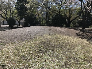 高射砲第七連隊(東部第七十八部隊)陣営地境界の土塁は、陣営地の周囲に築かれ、その断面からは、もともと東南への傾斜地であった敷地を平らにならした状況が確認できます。また、土塁が残るさいかち公園付近には、射撃場や土塁とは別に10メートルほど高い土手に囲まれた火薬庫(弾薬庫)が設置されていました。
