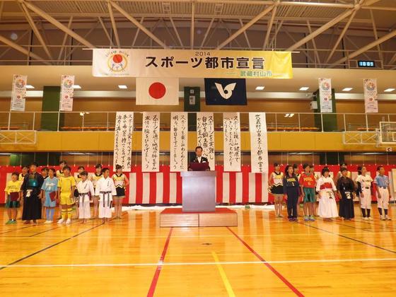 武蔵村山市は、平成26年10月5日、総合体育館で記念式典を挙行し、スポーツ都市の宣言を行いました。